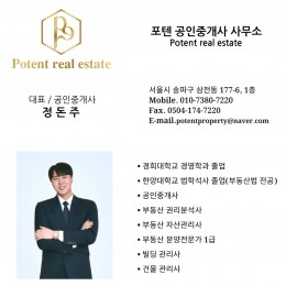 - 본 게시물은 포텐 공인중개사 사무소 에서 제공한 자료로 개인정보를 포함하고 있으며 임의유포, 수집, 배포가 금지됩니다.
